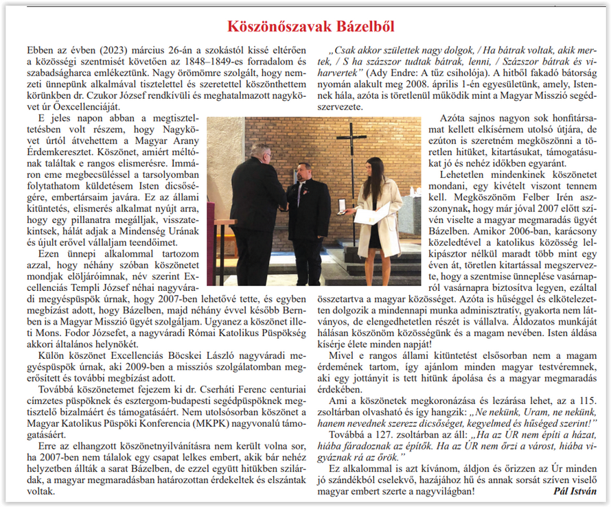 Magyarország Köztársasági Elnöke a Magyar Arany Érdemkereszt kitüntetést adományozta Pál István, a Szent Erzsébet Katolikus Magyar Bázeli Misszió lelkipásztora részére a Svájcban élő magyar katolikus közösség identitásának megőrzését és hitéletének biztosítását szolgáló munkája elismeréseként. A kitüntetést István atyának 2023. március 26-án Bázelben a magyar szentmisét követő nemzeti ünnepi megemlékezésen adta át Dr. Czukor József, Magyarország rendkívüli és meghatalmazott berni nagykövete és dr. Kroll Eszter konzul. A kitüntetések átvételéhez mindkét díjazottnak szeretettel gratulálunk! (az Életünk újság Szerkesztősége)